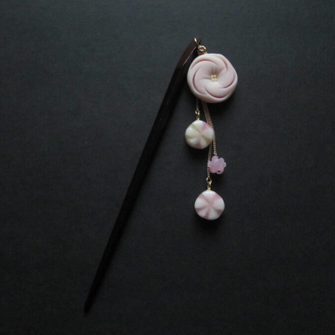 元和菓子職人が樹脂粘土やレジンで本物とほぼ同じ工程で製作した和菓子風の簪です。