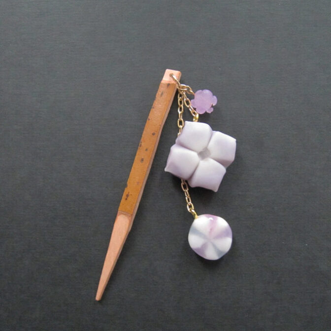 元和菓子職人が樹脂粘土やレジンで本物とほぼ同じ工程で製作した和菓子風の帯飾りです。